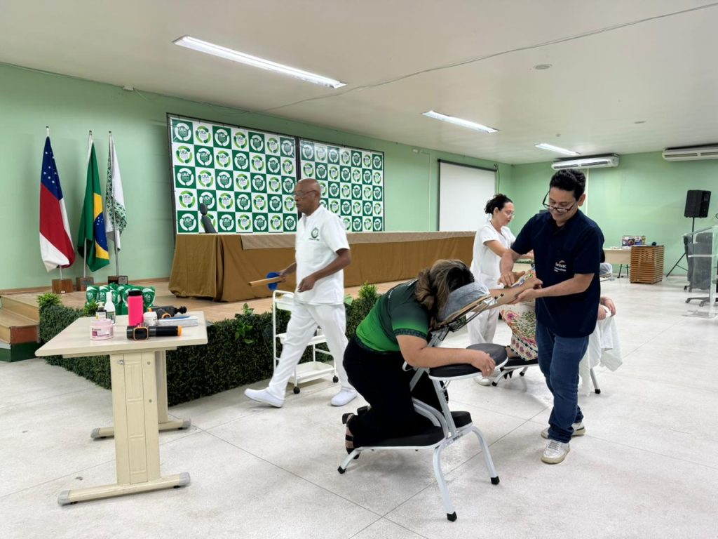 e massagem relaxante. Esses momentos proporcionaram aos participantes oportunidades de relaxamento e integração, reforçando a valorização da saúde física e emocional.