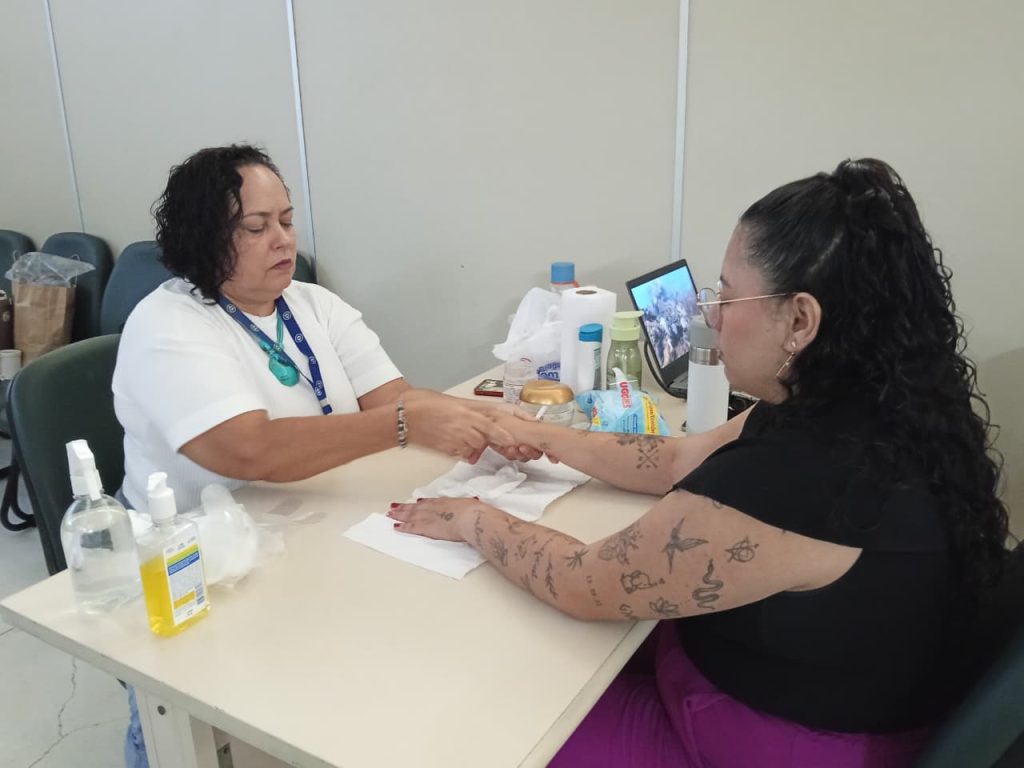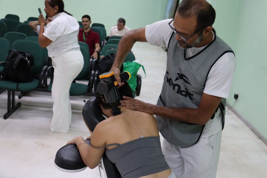 No período da tarde, foram ofertados diversos serviços de cuidado e beleza, incluindo sessões de massoterapia realizadas em parceria com o Serviço Nacional de Aprendizagem Comercial (Senac), além de atividades como curso de maquiagem e serviços de corte de cabelo, escova e modelagem com babyliss.