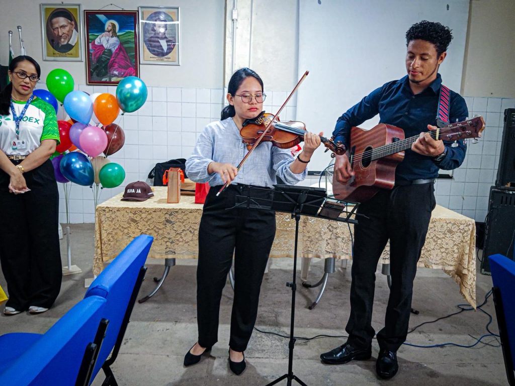 Um dos momentos mais marcantes da ação foi a apresentação musical dos alunos da Escola Superior de Artes e Turismo (ESAT). O estudante Dan Felipe, no violão, e a aluna Ayesha Lima, no violino, emocionaram o público com um repertório que proporcionou leveza e alegria ao ambiente.