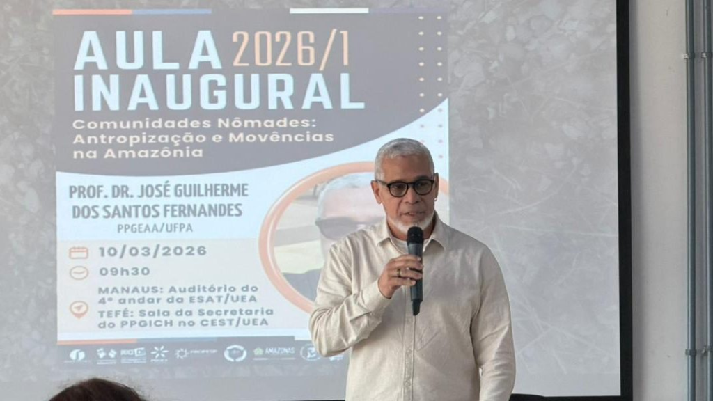 O Programa de Pós-Graduação Interdisciplinar em Ciências Humanas da Universidade do Estado do Amazonas (PPGICH/UEA) realizou, nesta terça-feira (10/3), uma aula inaugural reunindo estudantes, professores e pesquisadores com a conferência “Comunidades nômades: antropização e movências na Amazônia”. A palestra foi ministrada pelo Prof. Dr. José Guilherme dos Santos Fernandes, docente da Universidade Federal do Pará (UFPA) e coordenador do Programa de Pós-Graduação em Estudos Antrópicos na Amazônia (PPGEAA/UFPA).